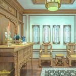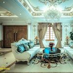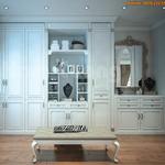 Phòng ngủ con trai trong thiết kế phòng ngủ của mẫu nội thất tân cổ điển được KTS thiết kế 1 giường ngủ, 2 tủ đầu giường, 1 bàn làm việc, 1 tủ quần áo, 1 tủ sách, 1 kệ tivi, 1 ghế giường theo nhu cầu sử dụng của chủ nhân căn phòng. Đồ dùng nội thất sử dụng trong phòng được thiết kế tone màu trắng với điểm nhấn là các hoa văn, phào chỉ chạm khắc trên chính thiết bị đó. Ngoài ra, tay cầm trên các đồ dùng này còn được KTS sử dụng màu vàng cổ điển giúp làm nổi bật không gian. Các đồ dùng nội thất đã sử dụng màu trắng nên KTS tạo điểm nhấn với thiết kế giấy dán tường màu xanh nhạt làm tôn lên vẻ đẹp cổ điển vô cùng sang trọng.