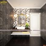 Phòng tắm sử màu xám làm chủ đạo, kết hợp với màu trắng làm tôn lên vẻ sang trọng và riêng tư cho không gian phòng tắm. Các phào chỉ màu vàng kim được thiết kế vô cùng tỉ mỉ và tinh tế càng làm nổi bật nên phong cách đặc trưng tân cổ điển. Bồn rửa được thiết kế đơn giản, tinh tế tạo nên vẻ sang trọng, quý phái của phòng tắm.