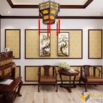 Phòng ngủ này có thiết kế hiện đại, đơn giản. Chiếc giường đẹp và mềm mại với những nét trang trí mảnh mai, như ăn nhập với phong cách căn phòng. Khu vực tường đơn giản với những đường nét nhỏ tạo ra các ô vuông đẹp, khá thú vị. Tuy nhiên không gian được thiết kế quá hài hòa nên điểm nhấn là bức tranh lớn trên tường không thực sự trở nên nổi bật. Trần phòng màu trắng đơn giản được trang điểm bởi hệ thống phao trắng muốt, cầu kỳ cho cảm giác trong trẻo. Hơn nữa chiếc đèn chùm được thiết kế như một chiếc cây treo ngược khá cầu kỳ, thu hút ánh nhìn cho căn phòng.