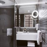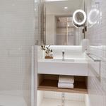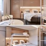 Phòng ngủ có khu vực làm việc trong không gian tươi sáng nhờ cửa kính lớn mang ánh sáng tự nhiên tràn ngập không gian phòng. Căn phòng có giường ngủ lớn mang lại sự thoải mái cho mọi người kết hợp cùng với tủ kệ quần áo độc đáo giúp căn phòng gọn gàng tinh tế