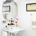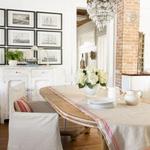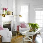Màu trắng được phủ hoàn toàn ở các bức tường và ghế sofa cùng với cách thiết kế các khung cửa sổ rộng rãi sẽ làm không gian trở nên thoáng sáng và rộng rãi hơn. Kệ để đồ nhỏ và chiếc bàn làm bằng chất liệu gỗ không trau chuốt sơn bóng, mà lại khá thô sơ, mang tới vẻ đẹp mộc mạc, giản dị và rất tự nhiên. Thiết kế lò sưởi vừa là nét đẹp đặc trưng của phương tây, vừa mang tới sự ấm áp, yên bình. Cây cảnh cũng được bày trí đan xen để căn phòng thêm phần cuốn hút. Màu hồng phấn được điểm xuyết nhẹ nhàng trên vật dụng gối ôm sẽ làm không gian thêm sặc sỡ và sinh động hơn.