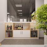 Không gian tiếp khách không thể bỏ qua những chén rượu chúc tụng chính vì thế KTS cũng cần thiết kế một tủ rượu nhỏ. Với chất liệu gỗ MDF bền đẹp, chiếc tủ rượu gọn gàng và bền chắc, mang vẻ đẹp bền bỉ với thời gian. Cây xanh cũng được bố trí để giúp không gian hiện đại có những đường nét tự nhiên và tạo không khí gần gũi.